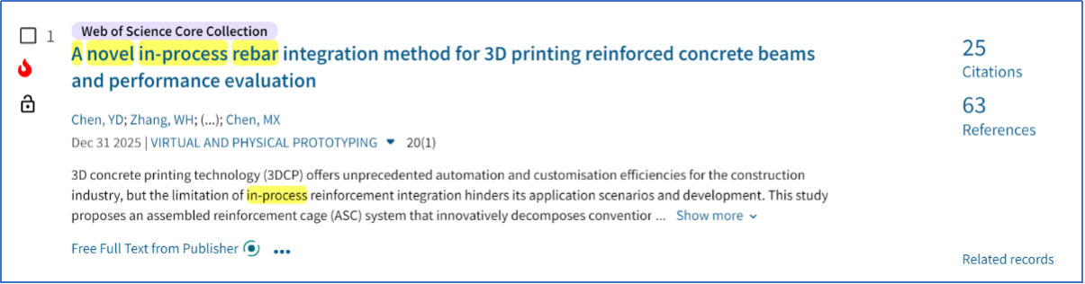近日,公司陈逸东老师作为第一作者的研究论文《A novel in-process rebar integration method for 3D printing reinforced concrete beams and performance evaluation》成功入选ESI热点论文,该成果发表于工程技术领域顶级期刊《Virtual and Physical Prototyping》(影响因子8.8,2025年中国科公司工程技术1区Top期刊),标志着公司在3D打印混凝土结构构件设计与生产领域的研究跻身国际前沿。