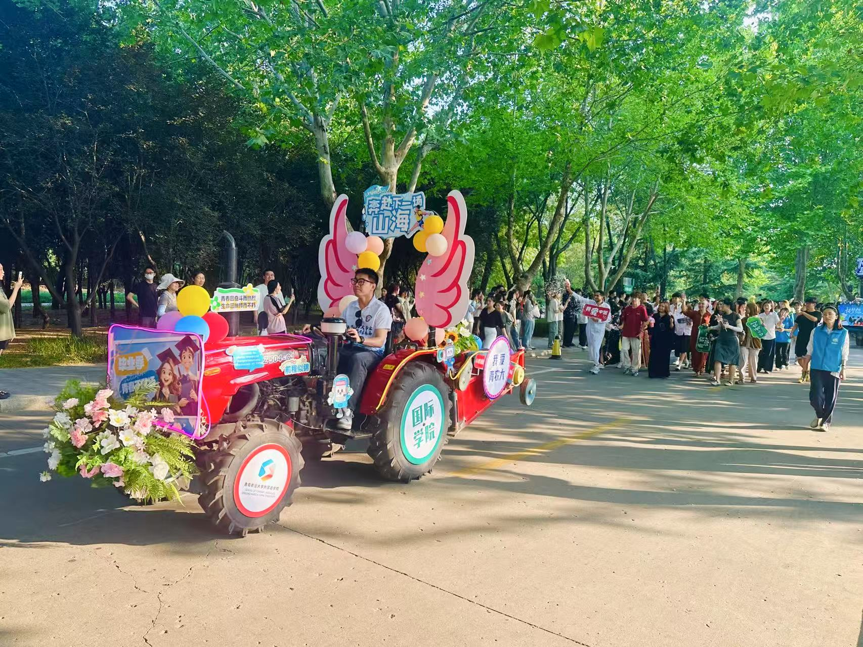 花车巡游是本次毕业欢乐节的一大亮点。随着公司党委书记潘军宣布开始,7辆现代化农机装备花车和员工队伍一起出发。由各公司精心设计、装饰的花车成为当之无愧的主角。同学们充分发挥土木、建筑等专业的创意与特色,将专业元素、青春梦想巧妙地融入花车设计中。花车巡游队伍在校园中缓缓行进。毕业生们身着建工特色服装随车步行,向沿途的师生挥手致意。巡游队伍所到之处,掌声、笑声、祝福声此起彼伏,充分展现了建工学子昂扬向上的精神风貌和同窗之间的深厚情谊。