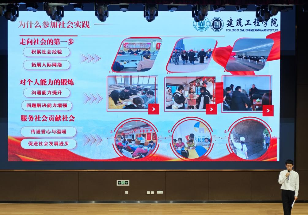 宣讲会上,刘朔围绕“为什么做”“做什么”“怎么做”三方面展开讲解,结合自身参与“古建筑测绘保护”、“关爱留守儿童支教”等项目的经历,分享了社会实践如何将专业知识转化为服务社会的有效路径。他指出,社会实践是高校人才培养的重要环节,是连接课堂与社会的桥梁,不仅有助于提升综合素质,也有助于员工发现潜能、拓展视野。